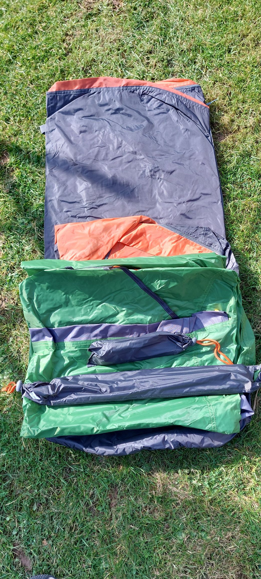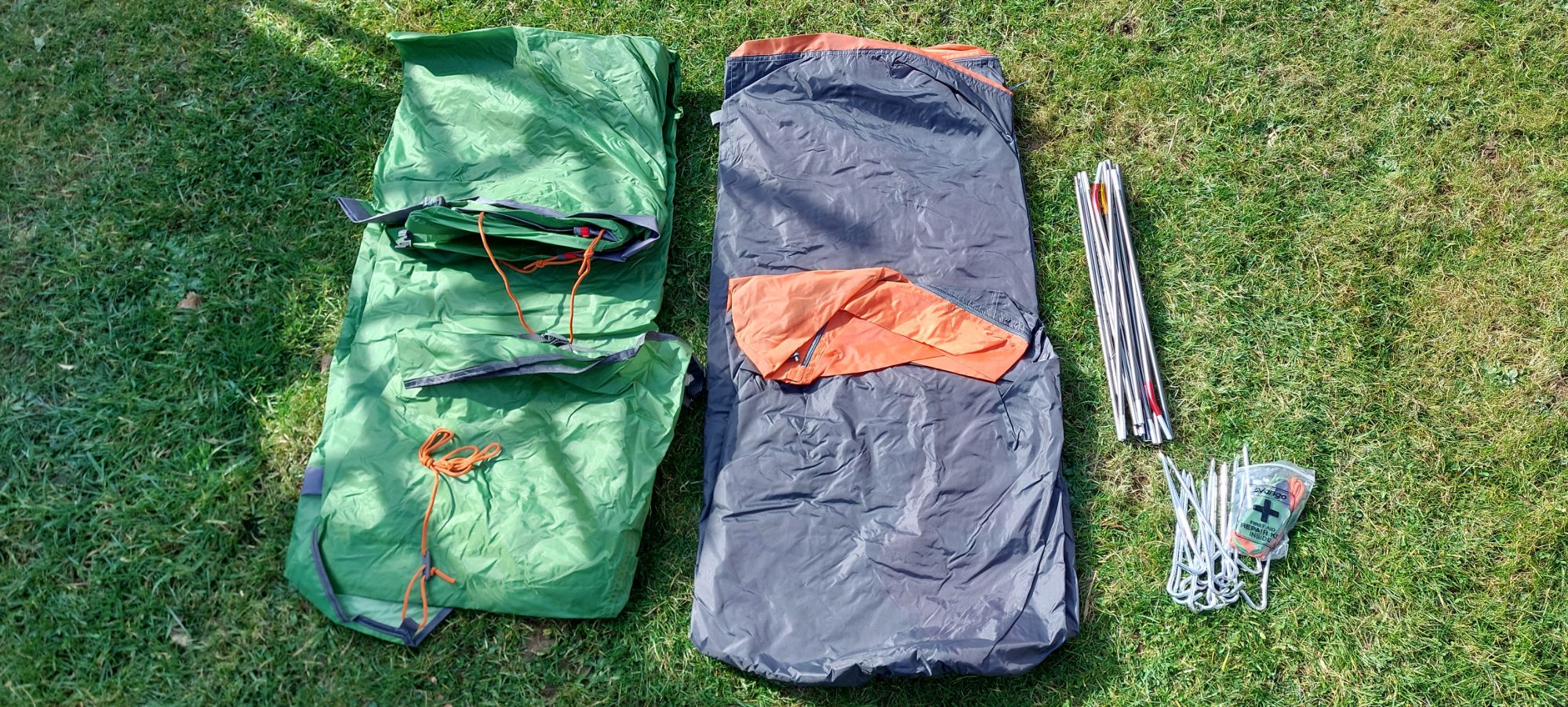 The tent comes in a nice waterproof tent bag with straps to tighten down and compact. Inside we have the inner layer, and the outer skin, plus a bag for the tent tension bands and a bag for the tent pegs, plus a small repair kit.