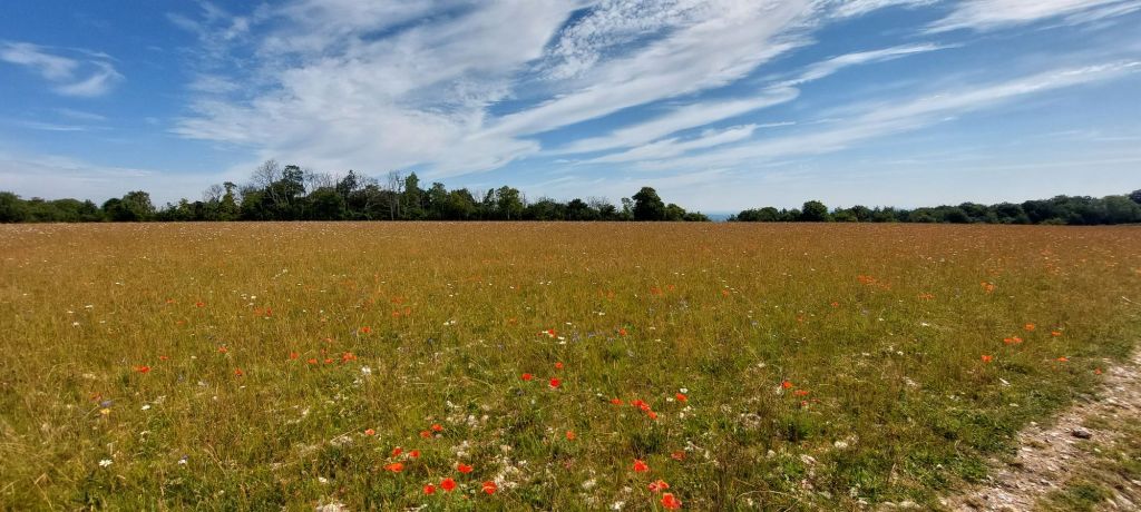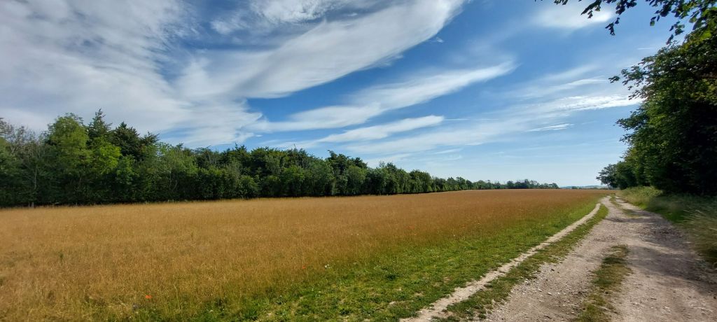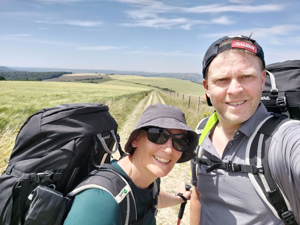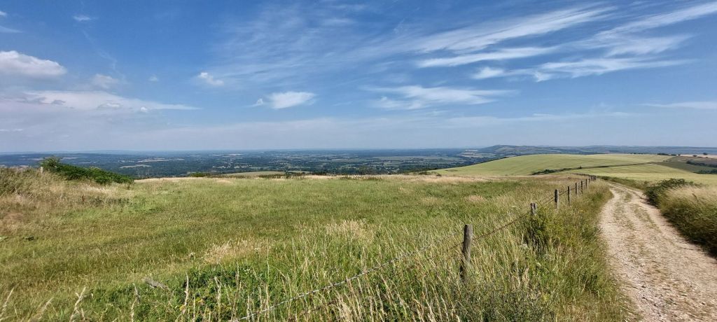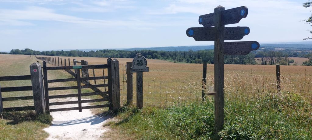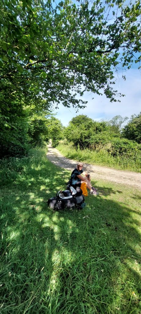 Lots more open fields and chalky paths with little respite from the sun, we were stopping more and more frequently to take off the bags, seemingly heavier every day. Stopped for lunch at 7.5 miles for some doorstop sandwiches made by the farmers’ wife for us, lovely.