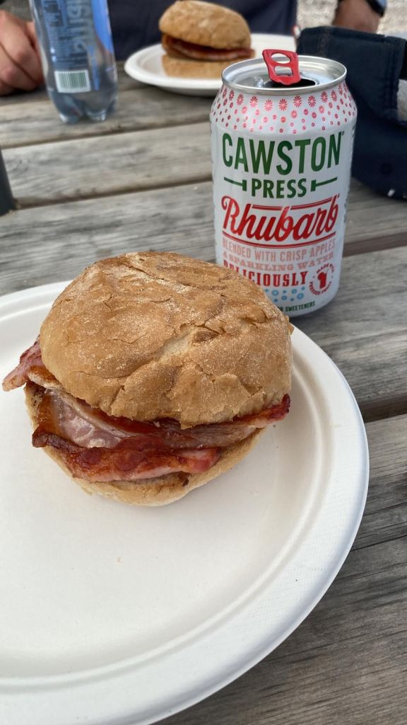 The route took us through the edge of some woods, which gave us some shelter, and then through lots of open fields down to the bottom of the valley at Upwaltham to another Cadence cafe. Bacon rolls the order of the day and refilled our water supplies. About 5 miles done.