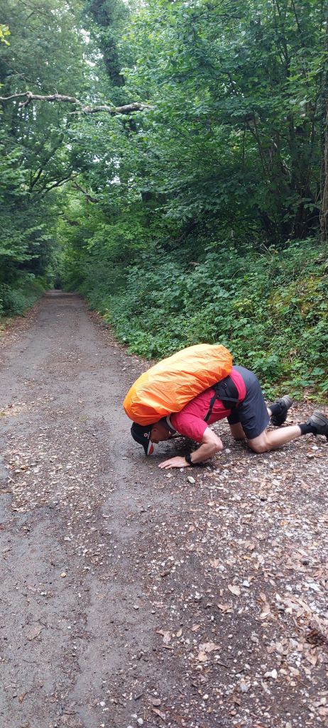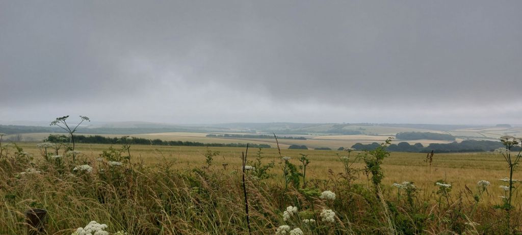 The rain soon blew over, leaving grey skies and low clouds, perfect for walking. Without needing to stop for a break from the heat we marched on through fields, only stopping a couple of times for water and photos, and feet repairs.