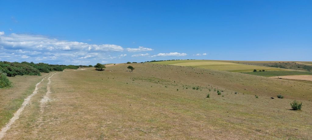 Even though we felt like on top of the world, the paths were still undulating until finally we started a long descent hrough endless fields down to our camp site at Housedean Farm.